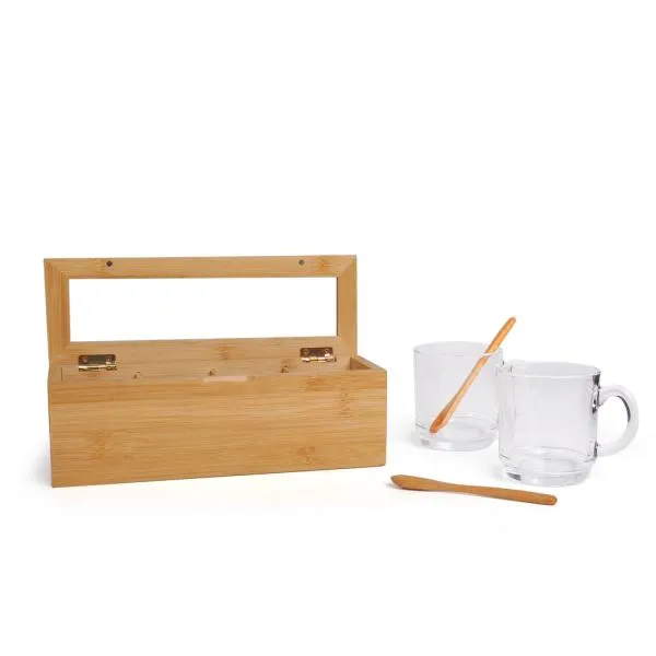 Composto por caixa para chás em Bambu/Poliestireno; duas colheres de 13 cm em Bambu e duas canecas de vidro com capacidade de 300 ml cada.