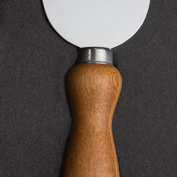 Kit para petisco/queijo. Conta com petisqueira em bambu; duas facas, sendo uma com ponta e outra reta, garfo e espátula em madeira/inox.