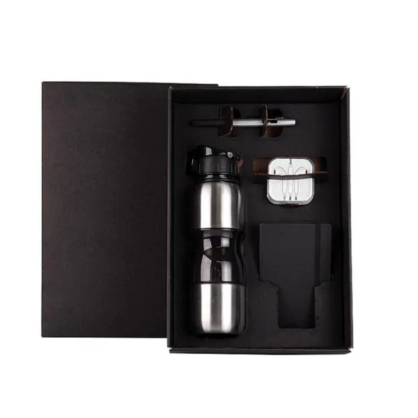 Conta com squeeze em Aço Inox 750ml; caneta em plástico ABS prata; caderno com pauta; fone de ouvido.
