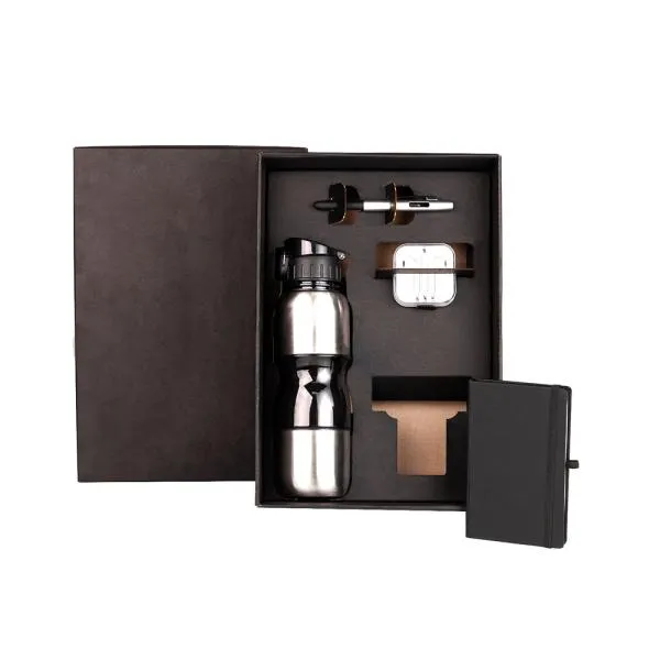 Conta com squeeze em aço inox; Caneta em plástico ABS prata; Caderno sem pauta; Fone de ouvido. Squeeze fumê revestido em aço inox 750ml. Acompanha copo rosqueável 200ml. Caneta com tampa e ponta touch. Caderno com 80 folhas não pautadas. Fone de ouvido conta com microfone e controle de volume.