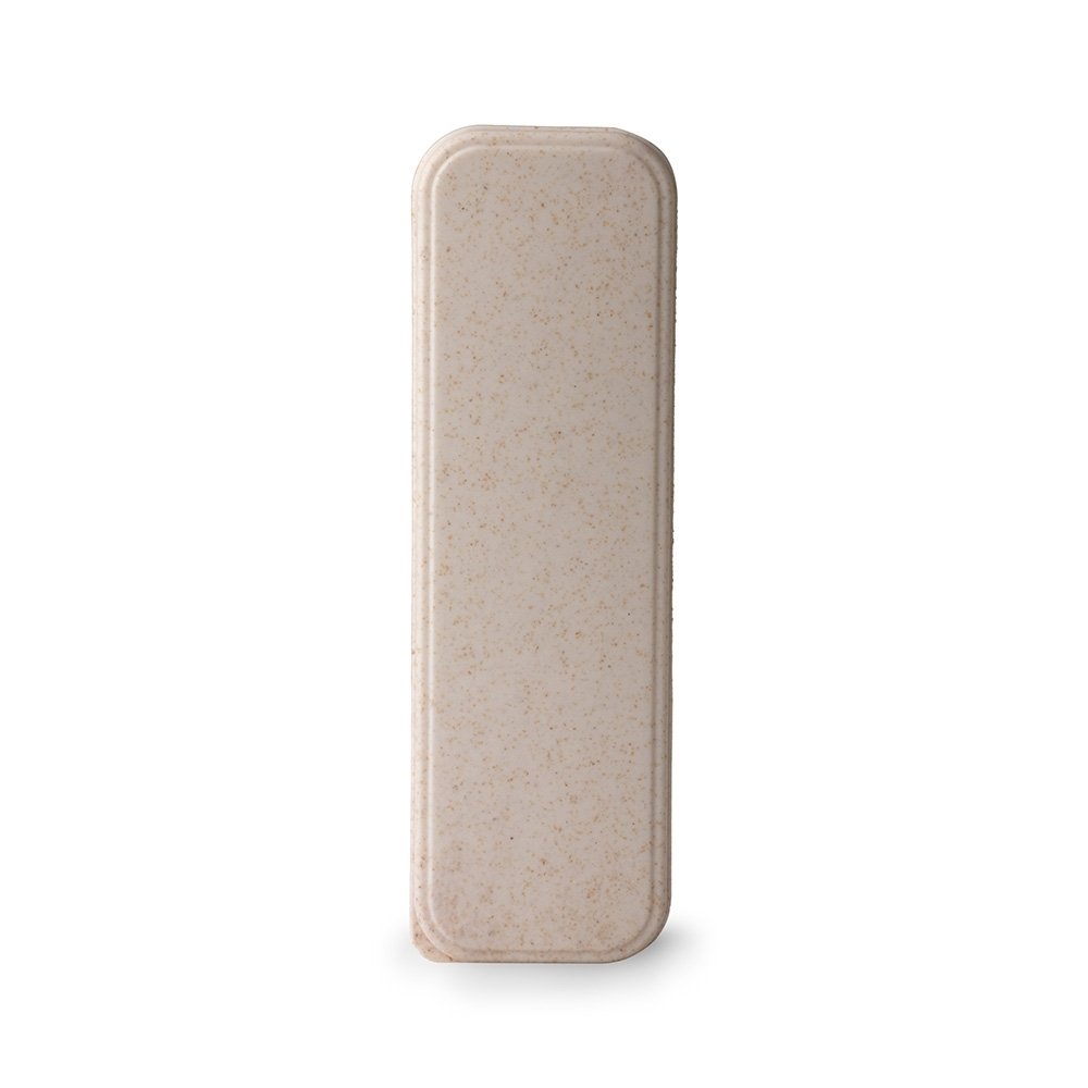 Kit de talheres em fibra de trigo. Contém três peças: garfo, faca e colher, acompanhadas de estojo com tampa de encaixe.