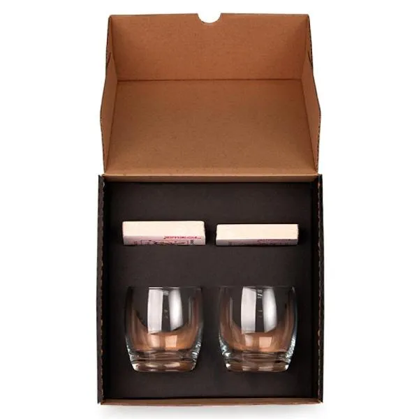 Kit whisky. Conta com dois copos em vidro e dois jogos de baralho. Estão perfeitamente acomodados em uma caixa para presentear.