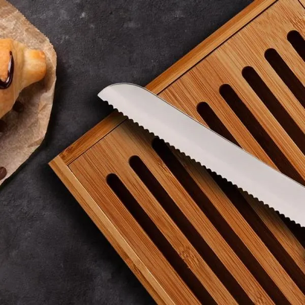 Confeccionada em bambu, possui grelha removível para melhor recolher as migalhas e uma faca 7” para pão com cabo em bambu e lâmina em aço Inox com rebites resistentes, que se encaixa perfeitamente na lateral da base.