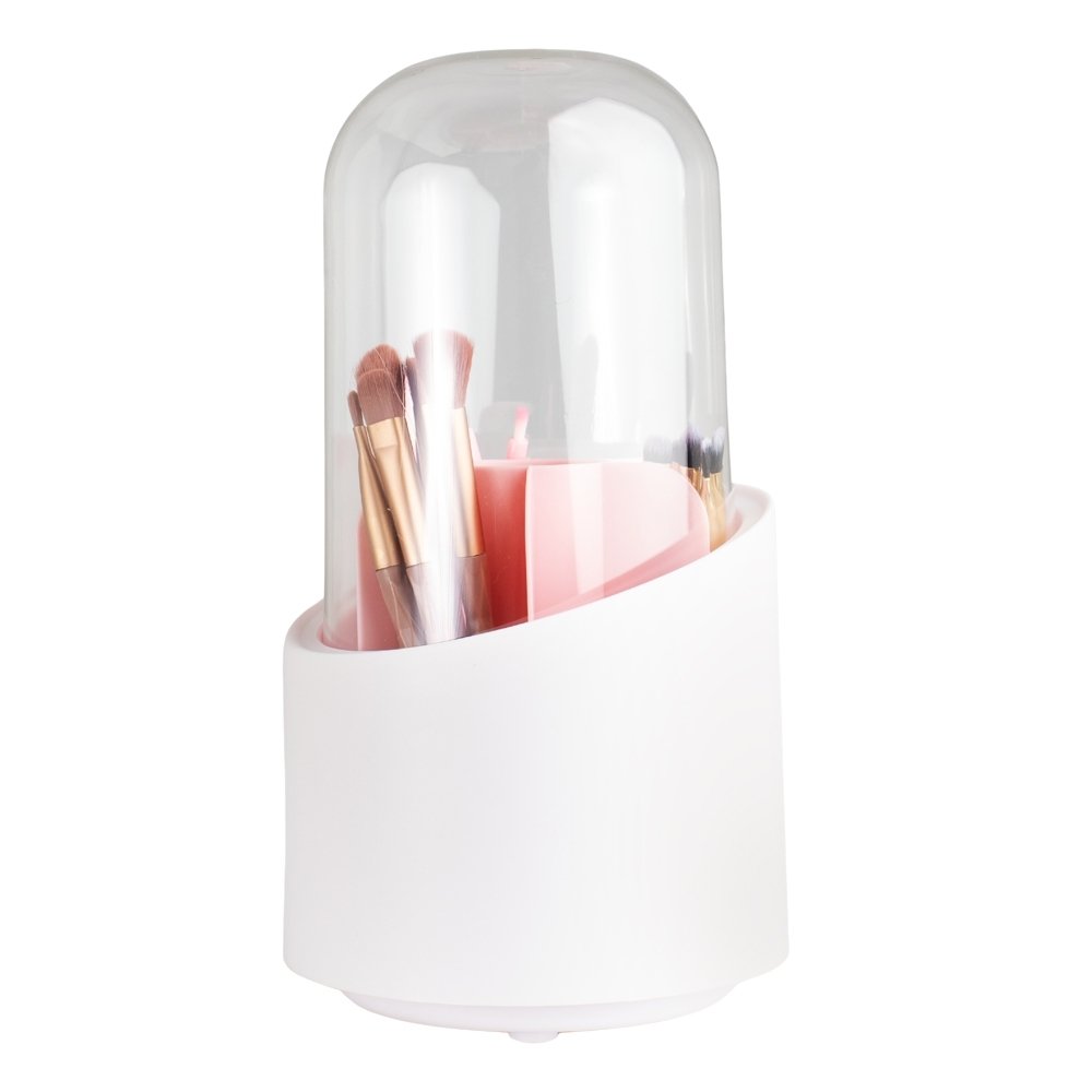 O organizador de pincéis de maquiagem possui uma base giratória de 360°, proporcionando acesso fácil e rápido às ferramentas de beleza. Sua capa transparente é impermeável e à prova de poeira, protegendo os pincéis contra danos e permitindo a visualização clara de cada item, facilitando a seleção do pincel ou cosmético desejado.
