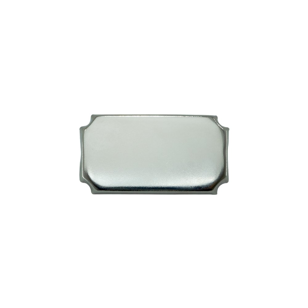 Plaquinha metálica para personalização. Possui acabamento fosco, hastes laterais com ponta na parte traseira, fure o tecido com as próprias hastes e dobre-as para fixação. Imagem com necessaire meramente ilustrativa.