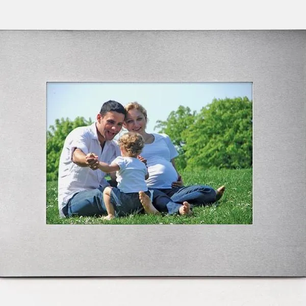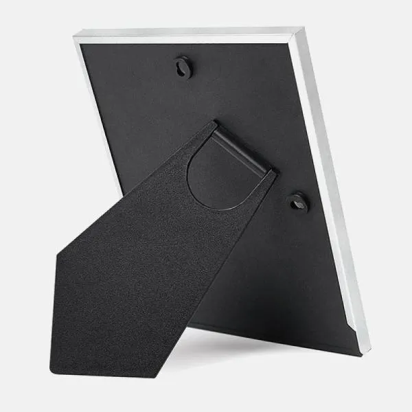 Porta-retrato em alumínio fosco. Conta com vidro frontal, apoio em polipropileno preto e uma fina espuma no interior para acomodar melhor a foto. Pode ser usado na vertical ou horizontal, tanto na parede quanto na superfície. Ideal para fotos 10x15cm com área útil visível de 9x13cm