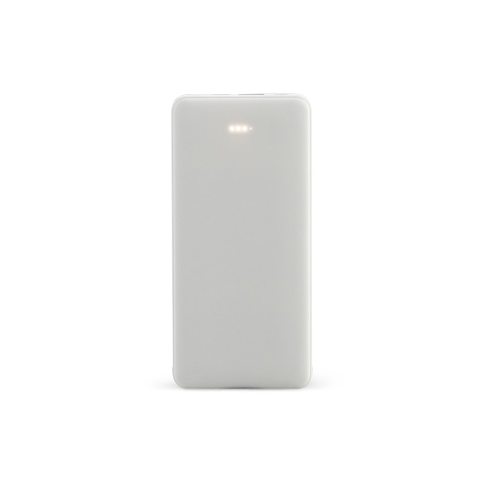 Power bank plástico de 10.000mAh com indicadores led de bateria e cabos acoplados: Tipo-C e V8. Acompanha cabo USB V8 e adaptador Lightning.