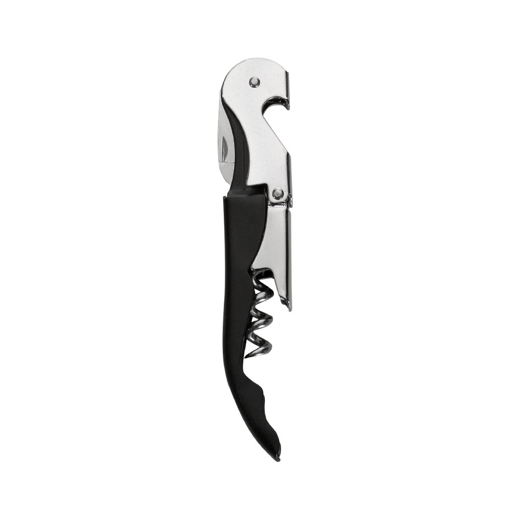 Saca-rolhas metálico de 2 estágios com acabamento brilhante. Contém abridor de garrafa, lâmina de corte e saca-rolhas.