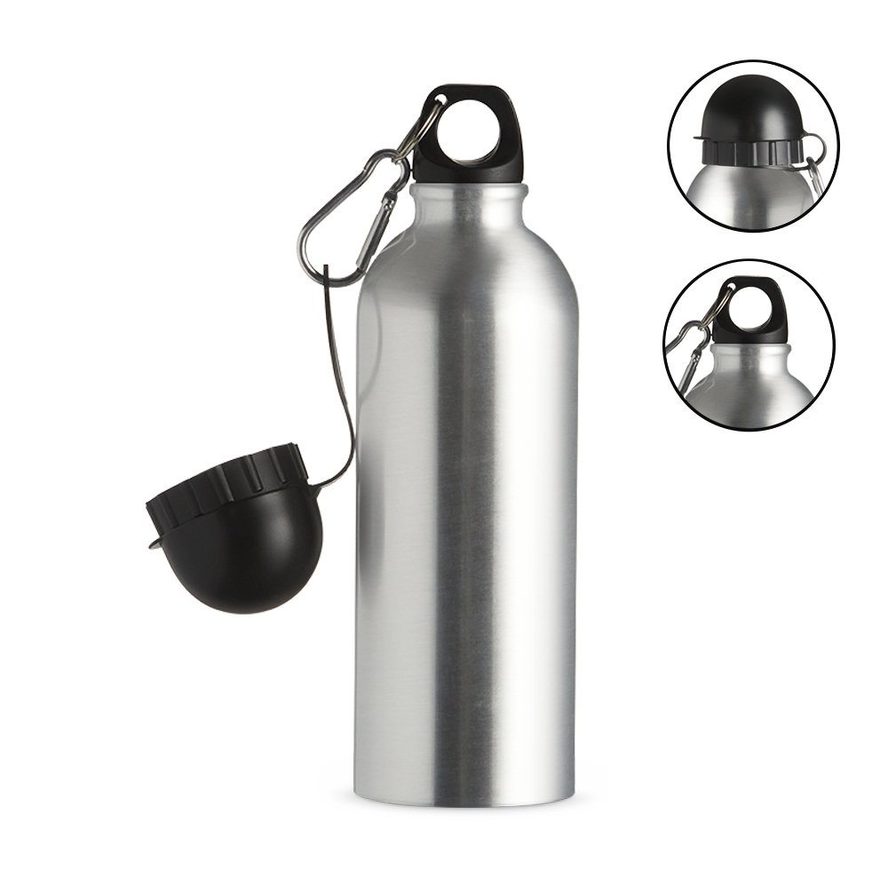 Squeeze 500ml de alumínio com pintura metalizada, tampa rosqueável e acompanha um segundo bico com mosquetão (não é térmico).