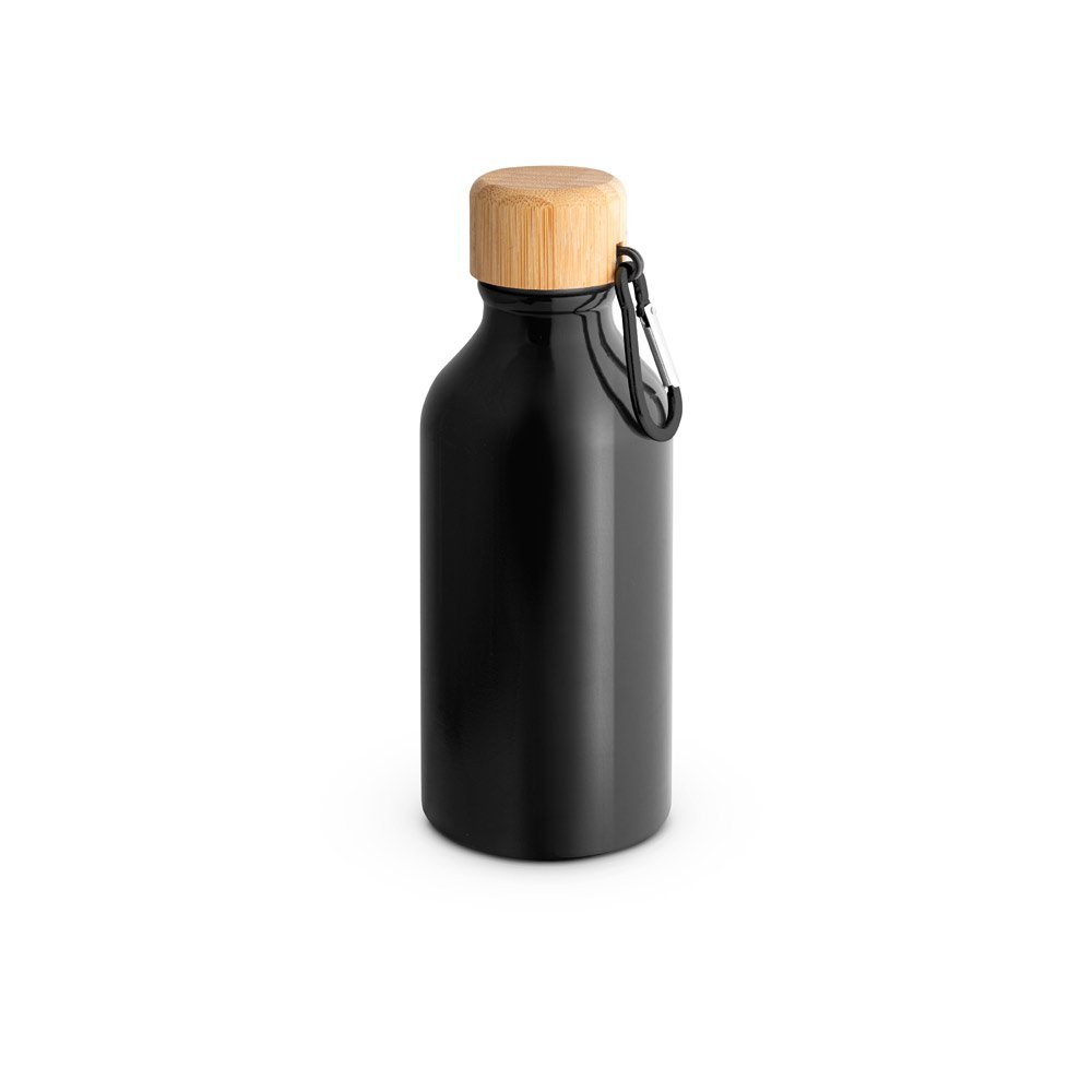 Squeeze em alumínio 100% reciclado com cor sólida brilhante. A squeeze tem uma tampa em bambu, à prova de água, e mosquetão que facilita o transporte. Capacidade até 400 mL. Caixa branca 94656 vendida opcionalmente. Certificação EU Food Grade. A cor e o resultado da impressão nos materiais naturais pode variar entre produtos. ø66 x 171 mm