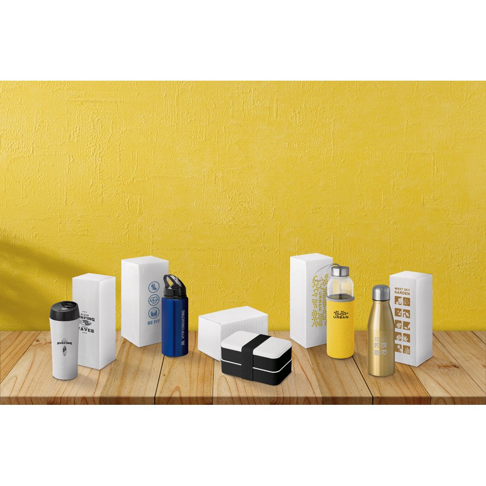 Squeeze em alumínio e tampa PP, com bico de canudo flip e canudo flexível no interior. Capacidade até 670 mL. Caixa branca 94652 vendida opcionalmente. Certificação EU Food Grade. ø73 x 217 mm