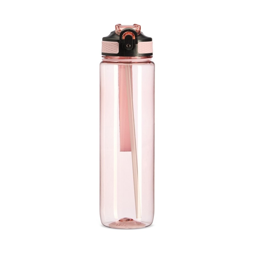 Squeeze plástico com capacidade de 1 litro, livre de BPA. Possui tampa rosqueável com bico de canudo, tampa protetora, botão de acionamento e trava de segurança. Acompanha cordão de nylon e canudo.