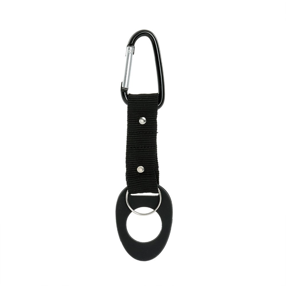 Este suporte é formado por uma alça de nylon ligada a um anel maleável, próprio para o encaixe em bocais de garrafas PET, em uma das pontas enquanto a outra apresenta um mosquetão e uma argola para chaveiro.