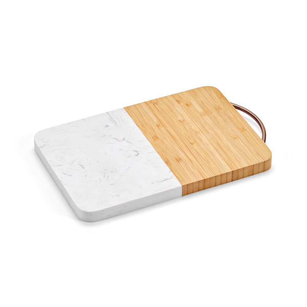 Tábua de corte em bambu e mármore em formato retangular. Contém pega metálica que facilita transporte e arrumação. Fornecido em caixa presente em papel kraft reciclado. Certificação EU Food Grade. A cor e o resultado da impressão nos materiais naturais pode variar entre produtos. 300 x 200 x 20 mm (sem pega)