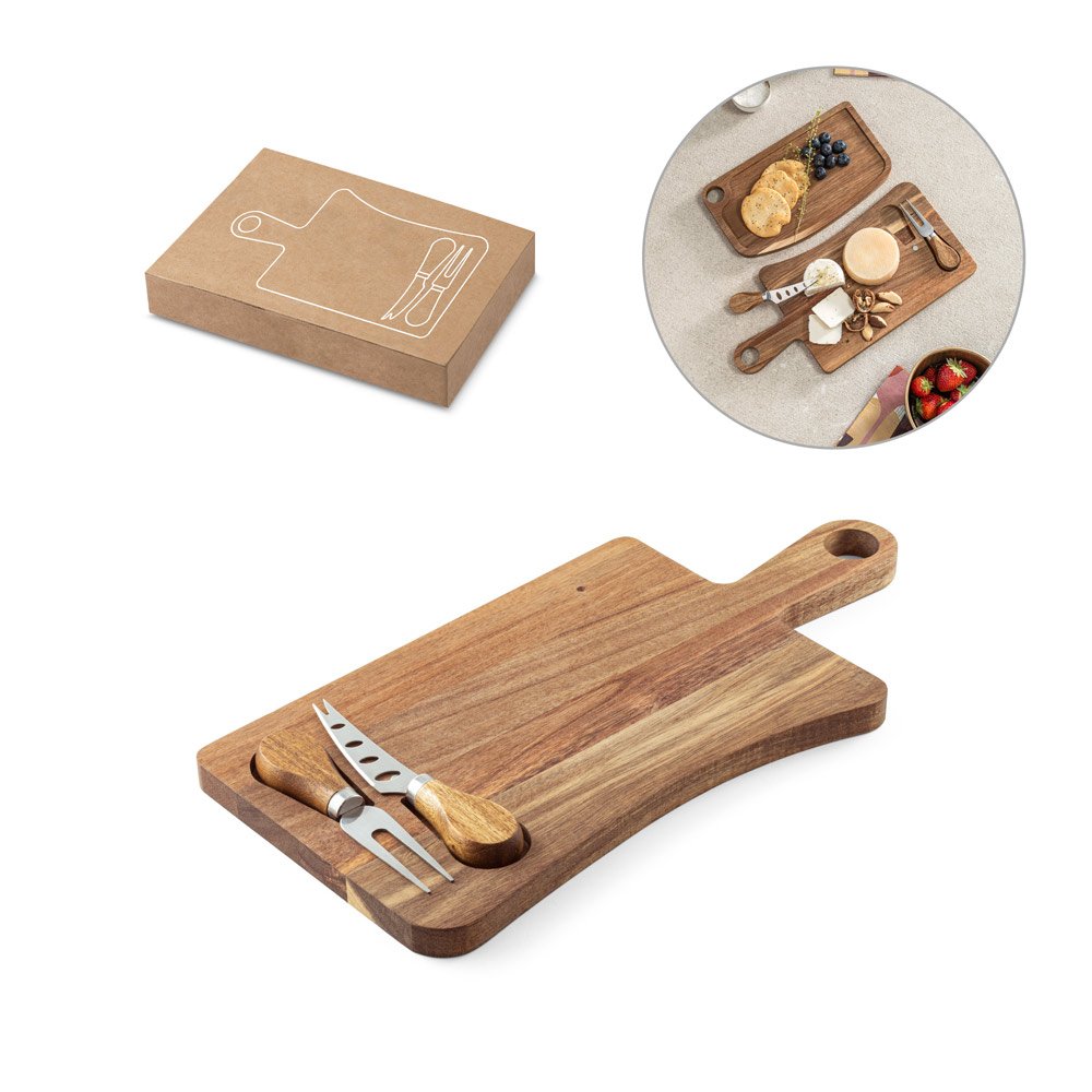 Tábua de queijos em madeira de acácia com 2 utensílios em madeira de acácia e aço inox
