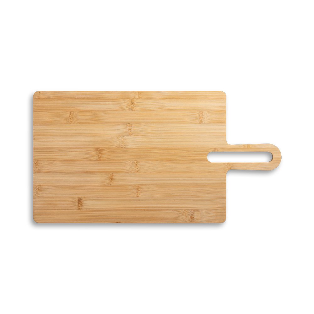 Tábua de servir em bambu com pega, de grande dimensão e de utilização versátil. Fornecido em caixa presente de papel kraft reciclado. Certificação EU Food Grade. A cor e o resultado da impressão nos materiais naturais pode variar entre produtos. 450 x 240 x 12 mm